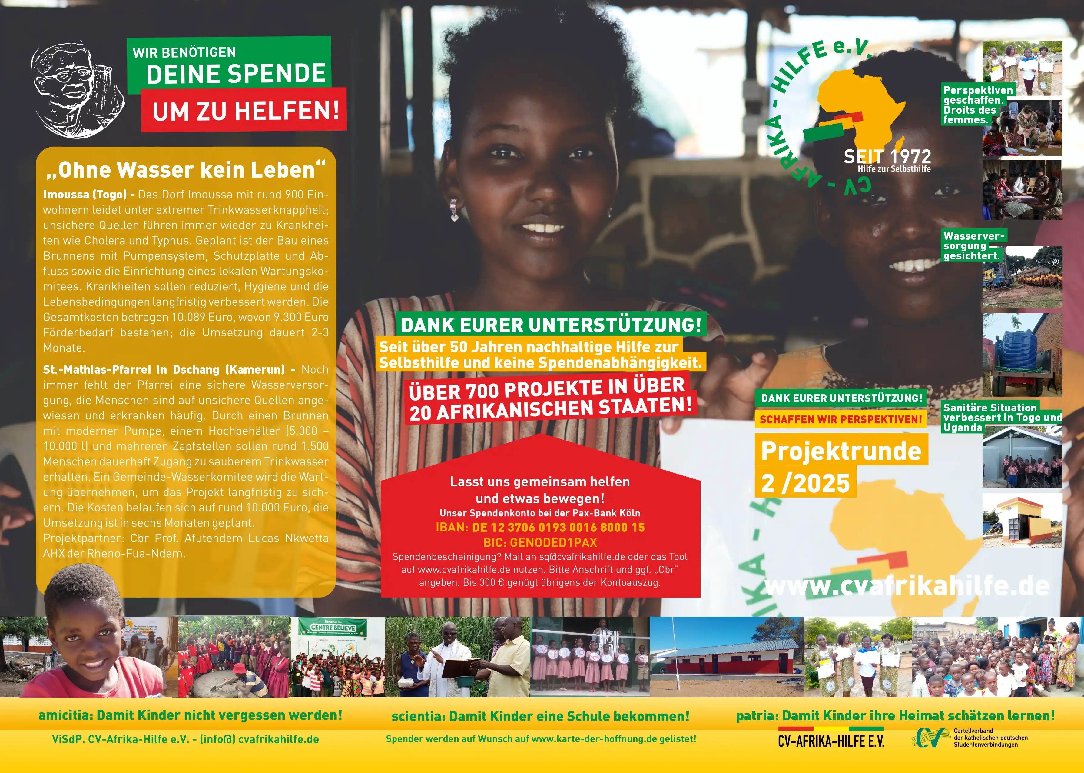 2025 – das dreiundfünfzigste Jahr der CV-Afrika-Hilfe – geht zu Ende. Mit großem Dank dürfen wir auf Eure großartige Unterstützung zurückblicken: mehr als 700 Projekte in über 20 afrikanischen Staaten wurden in den vergangenen Jahrzehnten Wirklichkeit. Auch in diesem Jahr konnten wir dank Eurer Hilfe viel bewegen: Jugendliche in Hoima (Uganda) erlernen an neuen Nähmaschinen einen Beruf und finden damit Zukunftsperspektiven. In Togo entstanden Räume, in denen Kinder und Jugendliche sicher spielen, lernen und in die Gemeinschaft hineinwachsen können. Schulen in Uganda erhielten Zugang zu sauberem Wasser und sanitären Anlagen – ein unschätzbarer Gewinn für Gesundheit, Würde und Bildung. Gemeinden im Kongo und Uganda feiern nun in würdevollen Kirchenräumen, die ein echtes Zuhause für die Gläubigen sind. Frauen in Äthiopien und Kenia lernten, wiederverwendbare Hygieneprodukte herzustellen und gewannen dadurch Selbstbestimmung, Teilhabe und neue Hoffnung. All diese Projekte zeigen: Mit vergleichsweise kleinen Mitteln lassen sich große Veränderungen bewirken. Jeder Beitrag schenkt Perspektive, Gesundheit, Würde und Zukunft. Allen Projekten ist jedoch eines gemeinsam – sie schaffen Perspektiven vor Ort. Das ist und bleibt die nachhaltigste Hilfe. Bitte hilf uns, auch 2026 das Leben vieler Kinder, Jugendlicher und Familien zu verbessern. Gemeinsam verwandeln wir Not in Hoffnung.