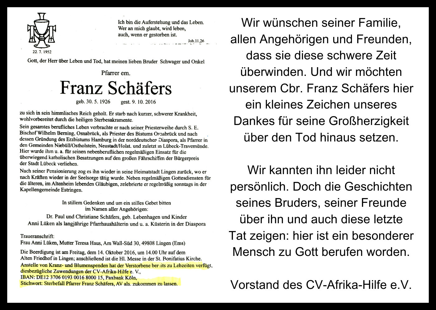 Text der Anzeige: Gott, der Herr über Leben und Tod, hat meinen lieben Bruder Schwager und Onkel Pfarrer em. Franz Schäfers (geb. 30. 5. 1926, gest. 9. 10. 2016) zu sich in sein himmlisches Reich geholt. Er starb nach kurzer, schwerer Krankheit, wohlvorbereitet durch die heiligen Sterbesakramente. Sein gesamtes berufliches Leben verbrachte er nach seiner Priesterweihe durch S. E. Bischof Wilhelm Berning, Osnabrück, als Priester des Bistums Osnabrück und nach dessen Gründung des Erzbistums Hamburg in der norddeutscher Diaspora, als Pfarrer in den Gemeinden Niebül/Ostholstein, Neustadt/Holst. und zuletzt in Lübeck-Travemünde. Hier wurde ihm u. a. für seinen nebenberuflichen regelmäßigen Einsatz für die überwiegend katholischen Besatzungen auf den großen Fährschiffen der Bürgerpreis der Stadt Lübeck verliehen. Nach seiner Pensionierung zog es ihn wieder in seine Heimatstadt Lingen zurück, wo er nach Kräften wieder in der Seelsorge tätig wurde. Neben regelmäßigen Gottesdiensten für die älteren, im Altenheim lebenden Gläubigen, zelebrierte er regelmäßig sonntags in der Kapellengemeinde Estringen. In stillem Gedenken und um ein stilles Gebet bitten im Namen aller Angehörigen: Paul und Christiane Schäfers, geb. Lebenhagen und Kinder. Anni Lüken als langjährige Pfarrhaushälterin und u. a. Küsterin in der Diaspora. […] Anstelle von Kranz- und Blumenspenden hat der Verstorbene bereits zu Lebzeiten verfügt, diesbezügliche Zuwendungen der CV-Afrika-Hilfe e. V., IBAN: DE12 3706 0193 0016 8000 15, Paxbank Köln, Stichwort: Sterbefall Pfarrer Franz Schäfers, AV als. zukommen zu lassen.