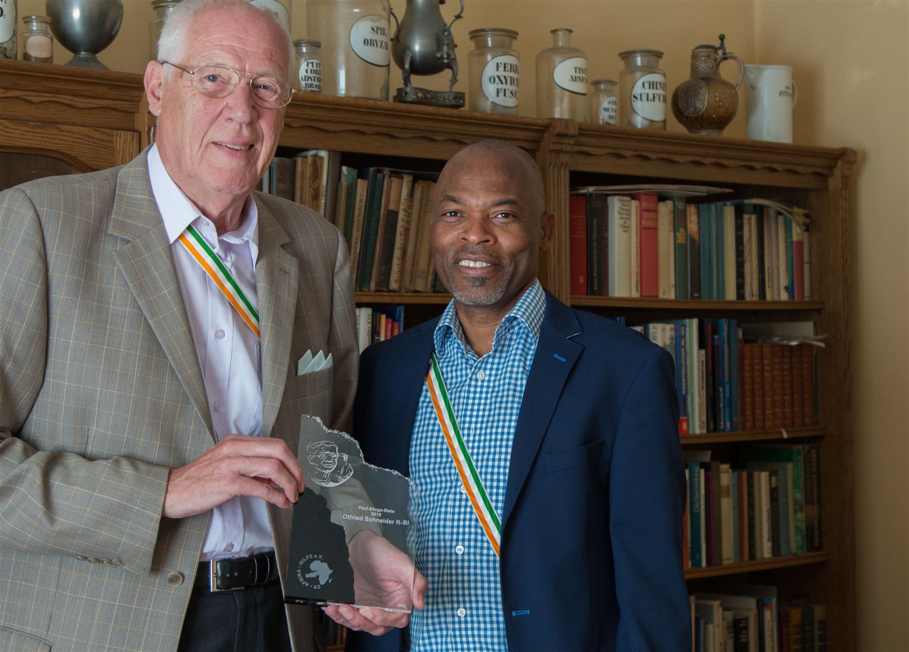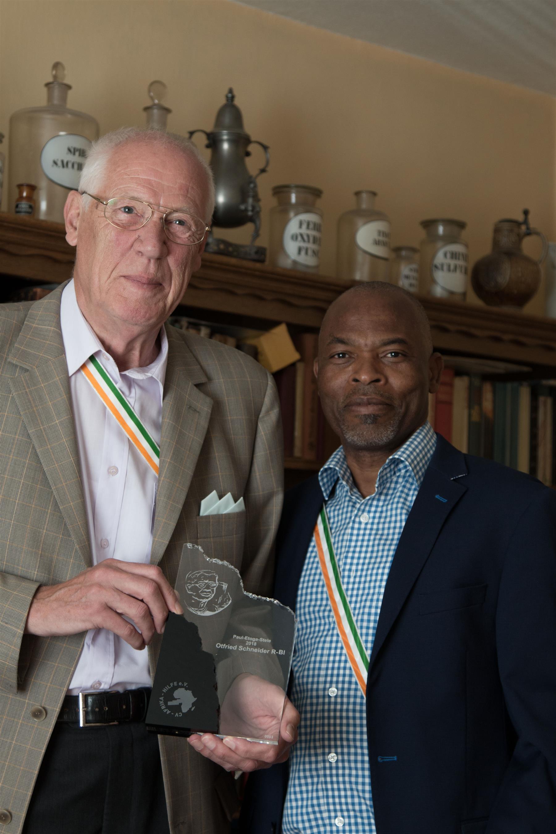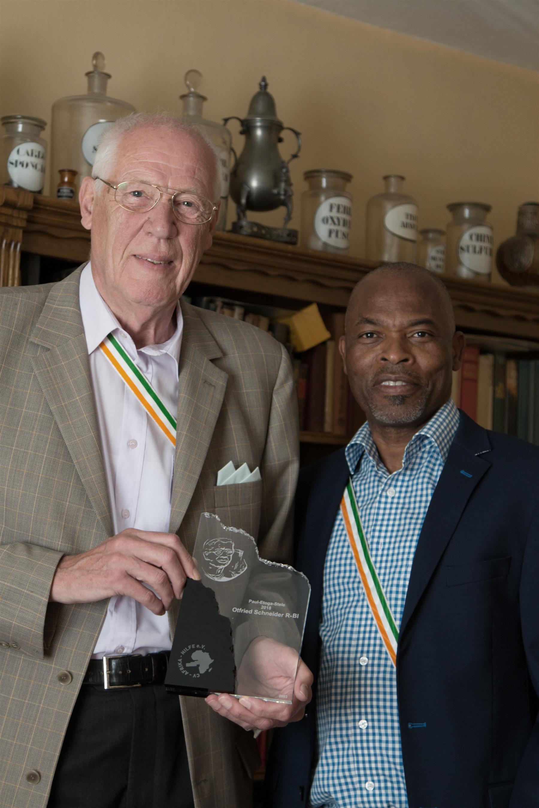 Beschlossen auf der vorletzten Vorstandssitzung hätte die Überreichung der 3. Paul-Etoga-Stele, als höchste Würdigung des Engagements um die Vereinsziele, im Rahmen der CXXXII. CV erfolgen sollen. Leider konnte unser Cbr. Otfried Schneider R-Bl nicht an der CV teilnehmen, so dass wir nur die Auslobung an ihn bekannt geben konnten. Am 25. Juli 2018 konnte der stv. Vorsitzende der CV-Afrika-Hilfe Cbr Anicet Tokple R-Bl RFN ihm die Auszeichnung persönlich überreichen.