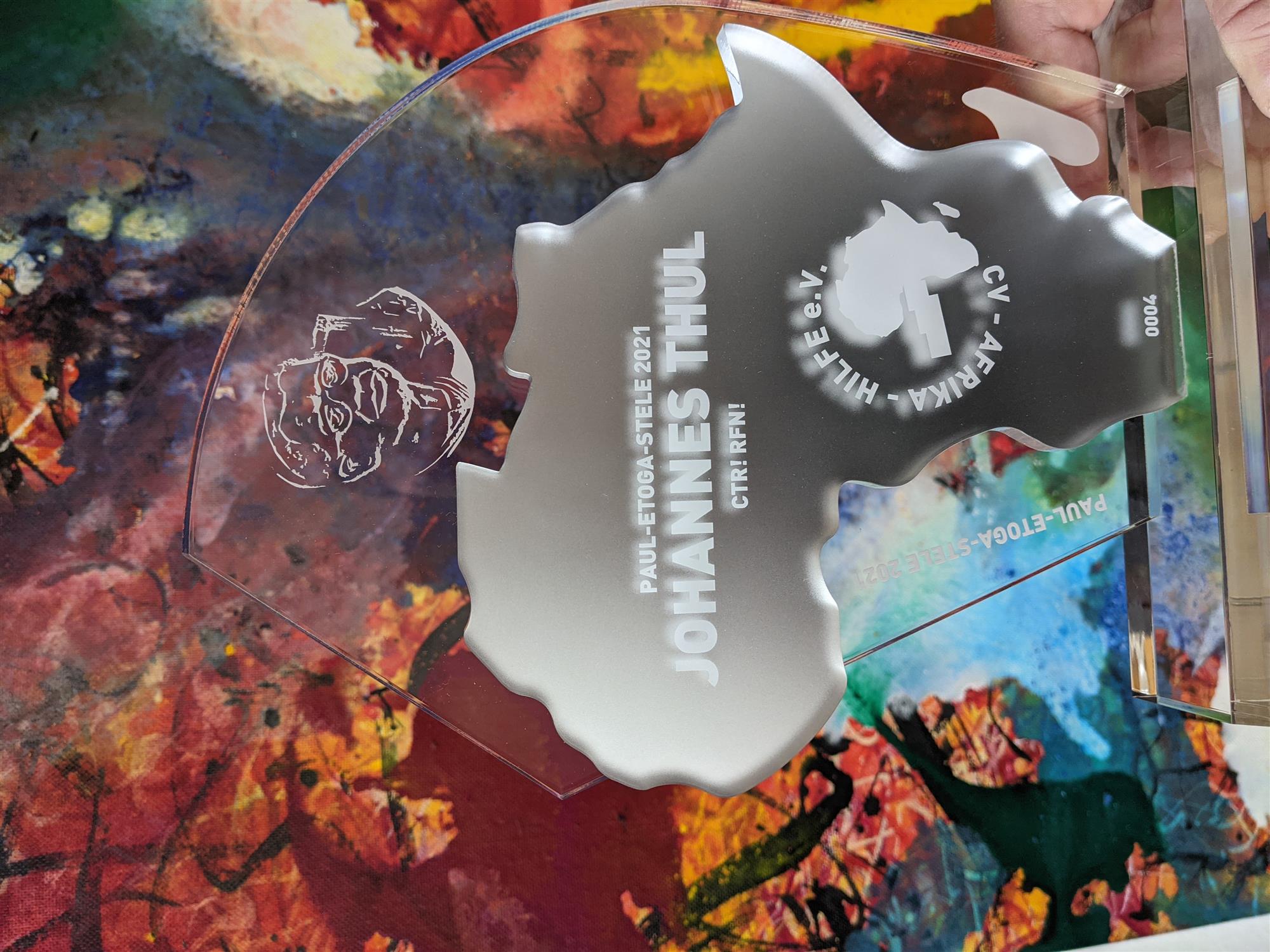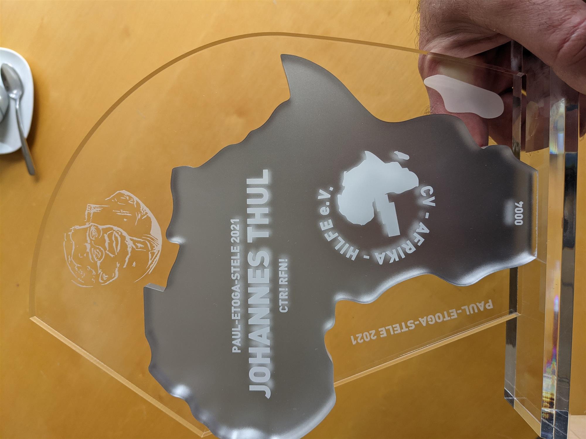 Der Neuentwurf der Paul-Etoga-Stele stammt von unserem Cartellbruder Phelan Andreas Neumann CM! RFN! aus 2021. Ziele waren die Betonung des Auszeichnungs-Charakters und eine klare Herausarbeitung, um was es sich bei der Auszeichnung genau handelt. Hierzu wurden einmal die Abmessung deutlich vergrößert und prominent steht nun -im wahrsten Sinne des Wortes und in Acrylic-Ice-Technik- der afrikanische Kontinent mit allen wichtigen Daten im Vordergrund. Dahinter kommt dann das angedeutete Segel, als die Kontinente seit Jahrhunderten verbindendes Element, mit dem Bildnis Bischof Paul Etogas.