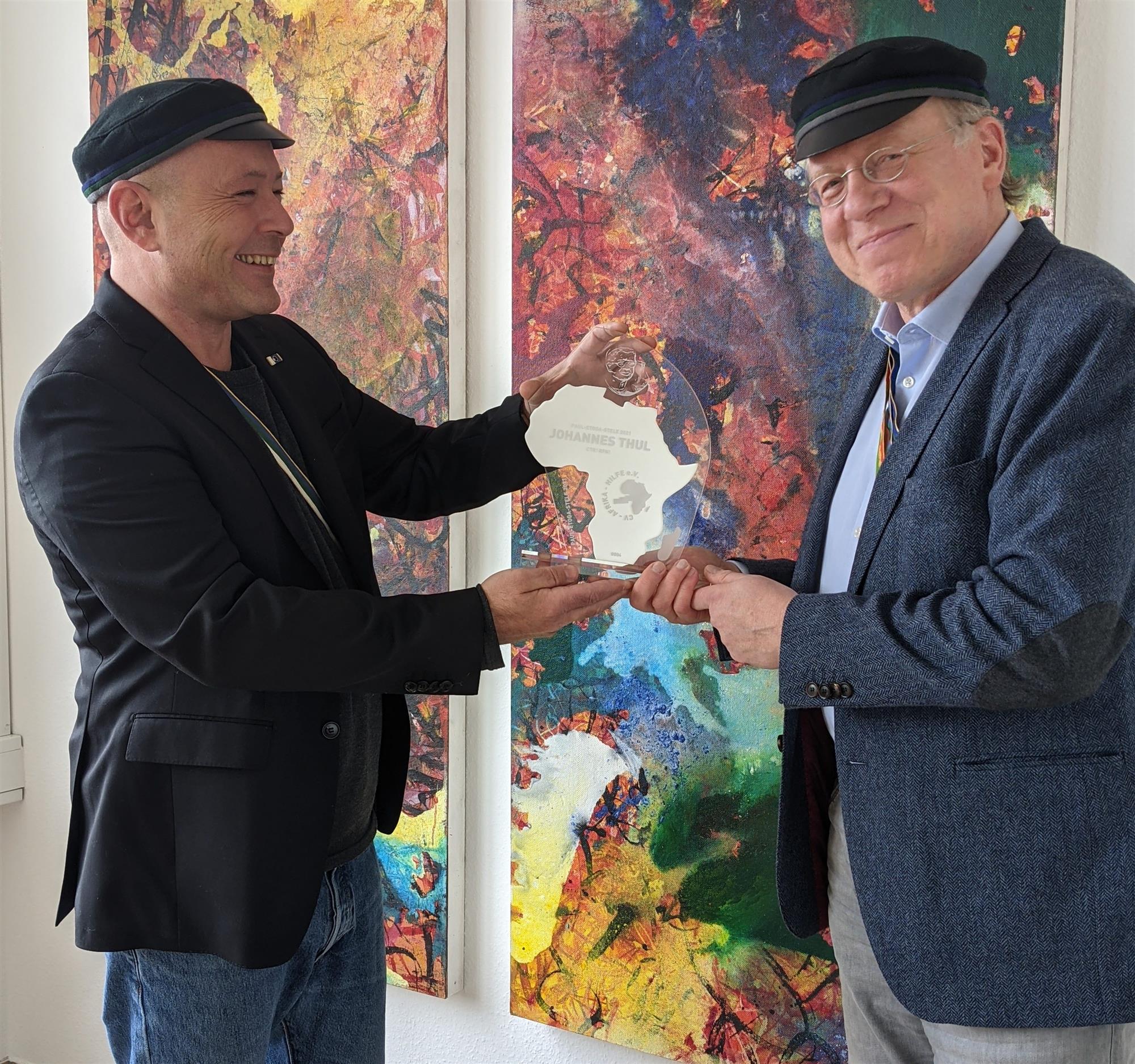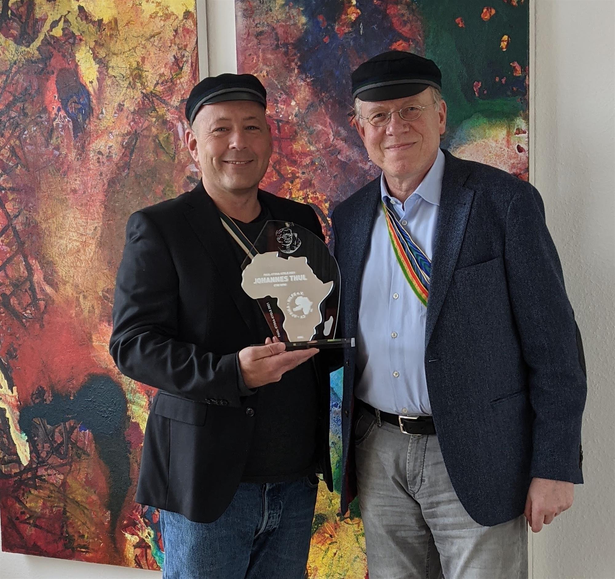 „Schatzmeister zu sein bedeutet viel Verantwortung zu tragen. Es gilt stets das richtige Maß zwischen der Verteidigung des ‚Schatzes‘ vor unnützen Ausgaben und der optimalen Nutzung aller Finanzmittel bei den Hilfe-zur-Selbsthilfe-Projekten vor Ort zu finden. Wenn ein Schatzmeister dann auch noch eigene Ideen entwickelt, u.a. wie man Abläufe optimieren kann, schnell mit Zahlen aushilft, sich nicht zu schade ist, Flyer in Aachen, München und sonst wo zu verteilen, eigene Projekte wie aktuell in Namibia begleitet, dann hat eine Mitgliederversammlung eine mehr als nur gute Wahl getroffen. Und in unserem Fall seit vielen, vielen Jahren. Es war mir eine Freude, Dir lieber Johannes, am heutigen Tage und im Namen der CV-Afrika-Hilfe unsere wichtigste Auszeichnung und unser Zeichen der höchste Wertschätzung für eine engagierte, jahrelange Arbeit zum Wohle anderer Menschen zu überreichen. Bleib so wie Du bist und vor allem unserem Verein noch lange Zeit erhalten. Für den vergangenen Einsatz ein von Herzen kommendes Dankschön im Namen aller Beteiligten.“